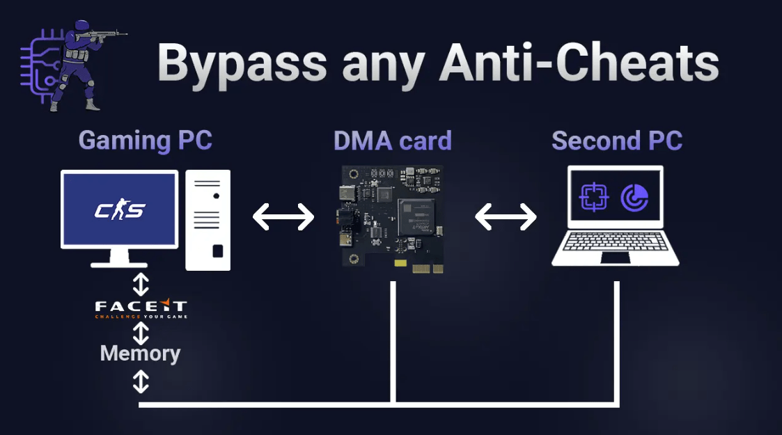 Может показаться, что, обладая знаниями о том, как работают 90% читов, решение этой проблемы должно быть простым. В конце концов, большинство читов выполняется на персональных компьютерах (ПК), что, казалось бы, делает разработку программы, которая сканирует все файлы на компьютере и обнаруживает вредоносное ПО, довольно легкой задачей. Эта идея привела к созданию античит-решения Faceit, которое работает на уровне драйвера для тщательного сканирования каждого компьютера. Такой тип античита, известный как «драйвер-базированное» решение, обладает повышенными привилегиями в операционной системе Windows. В результате, компьютер может испытывать трудности в определении, было ли программное обеспечение античита специально установлено пользователем или оно было изначально установлено при настройке. Основная идея этого подхода — банить любое программное обеспечение, пытающееся внедриться в игру, еще до того, как оно достигнет уровня драйвера. Однако, несмотря на усилия Faceit и подобных систем, очевидно, что читеры все еще существуют. Возникает вопрос: как читеры могут обходить надежные меры античита, когда Faceit AC запускается на компьютере еще до самой Windows и отслеживает все запущенные процессы? Ответ кроется в том, что мы живем в 21 веке, где читы эволюционировали за пределы традиционных подходов на базе ПК. Это приводит нас к концепции специального устройства, известного как DMA (Direct Memory Access) карта. DMA карта — это специализированный аппаратный компонент, который можно вставить в компьютер. Ее основная функция — обеспечить прямой доступ к памяти компьютера, позволяя передавать данные на высокой скорости без вмешательства центрального процессора (CPU).